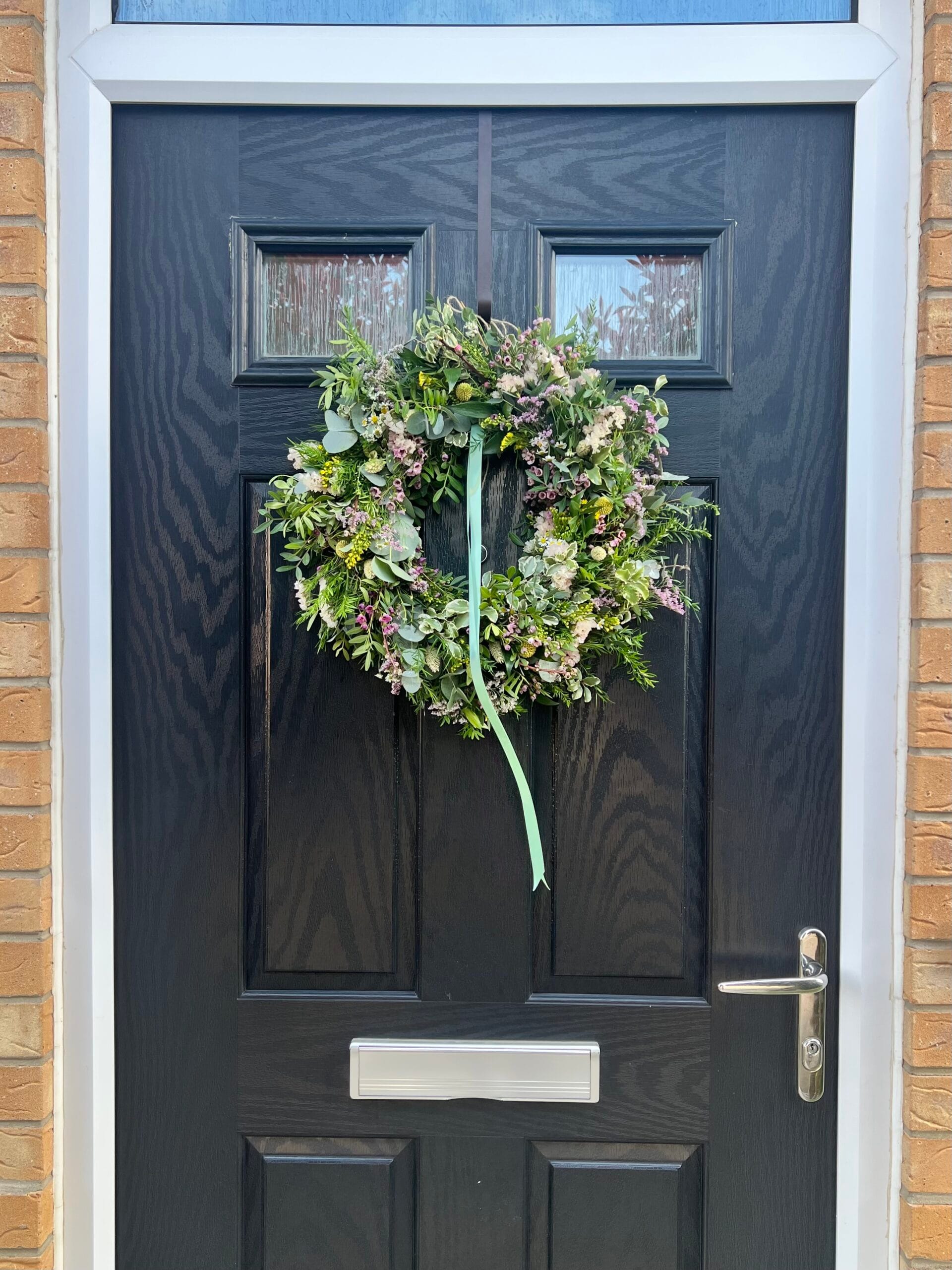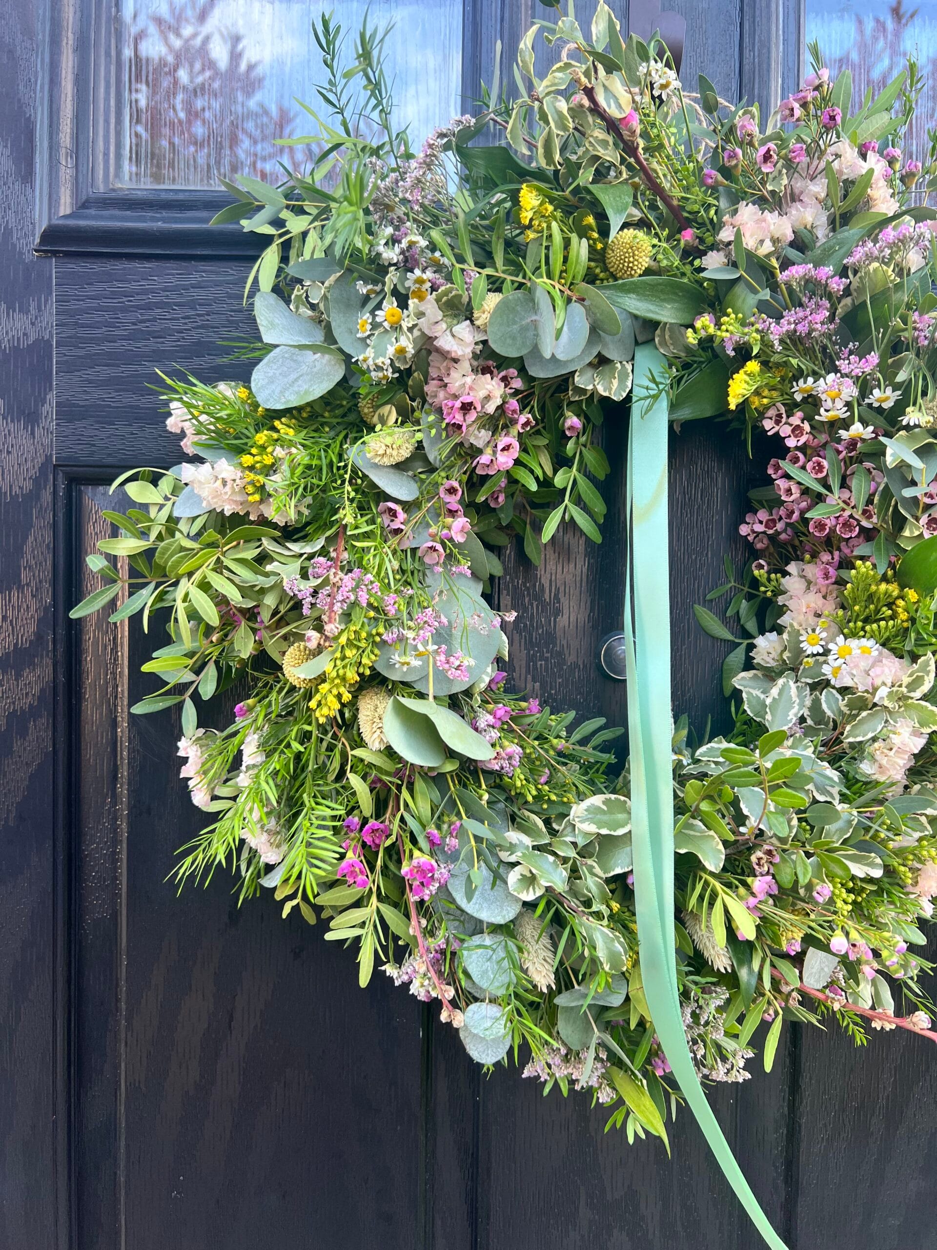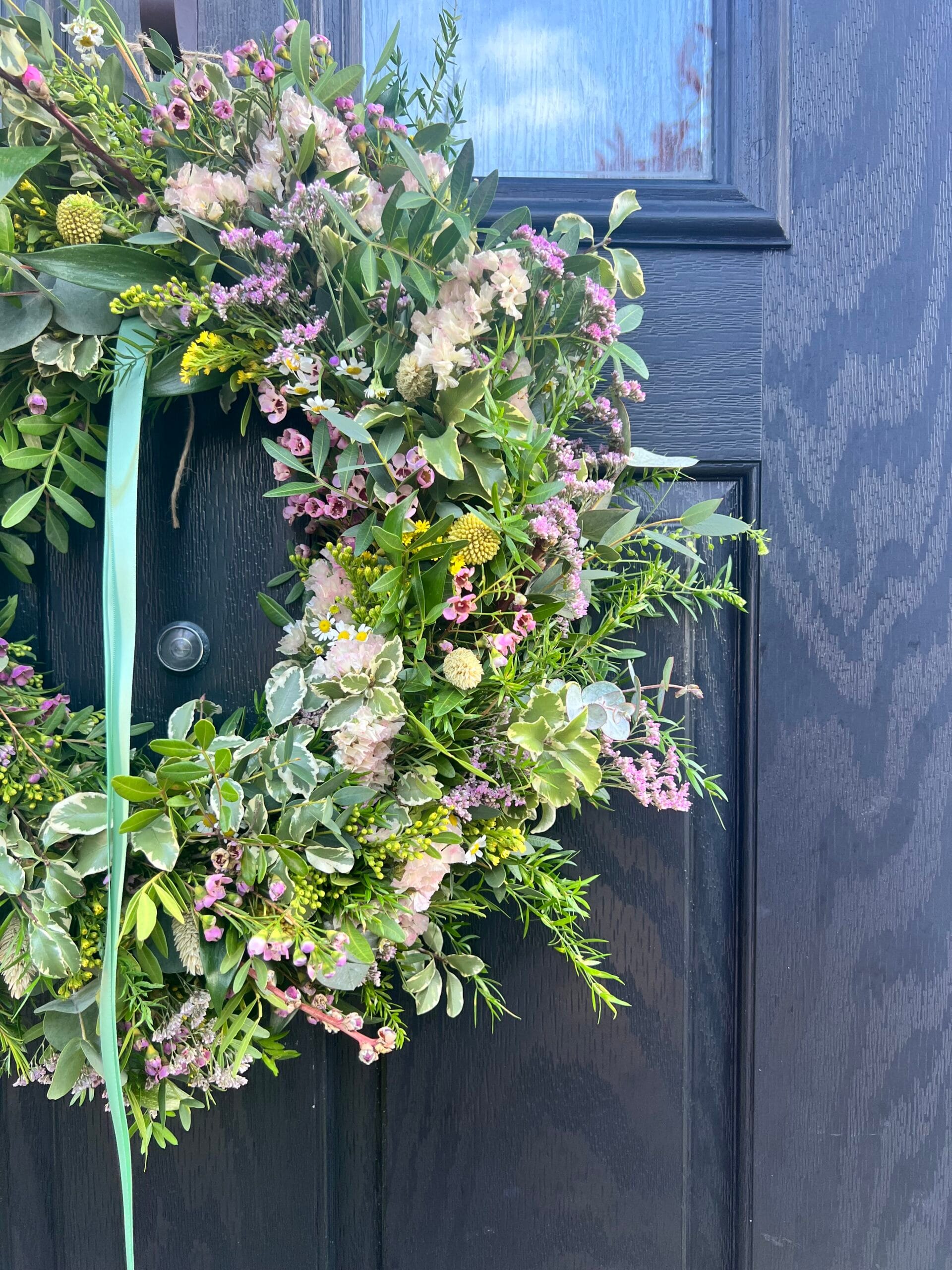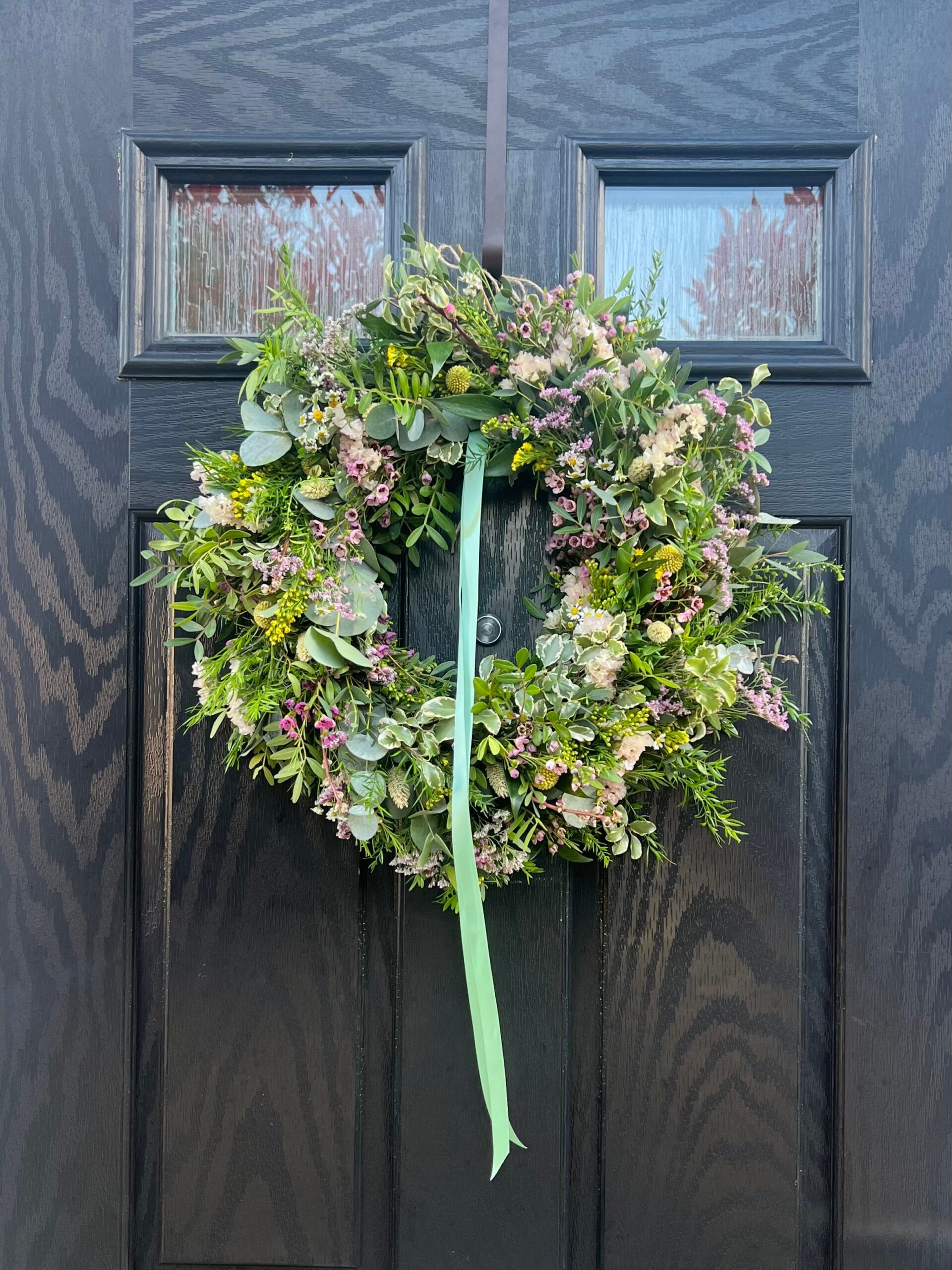 A beautiful spring wreath filled with a mix of fresh green foliage and soft seasonal blooms in shades of yellow, pink, white and apricot, complete with a gorgeous silk ribbon tail. Designed to feel light, natural and full of texture. Each wreath is carefully created to bring a fresh, welcoming touch to your front door. Perfect for celebrating the change in season and adding a little colour and life to your home.
