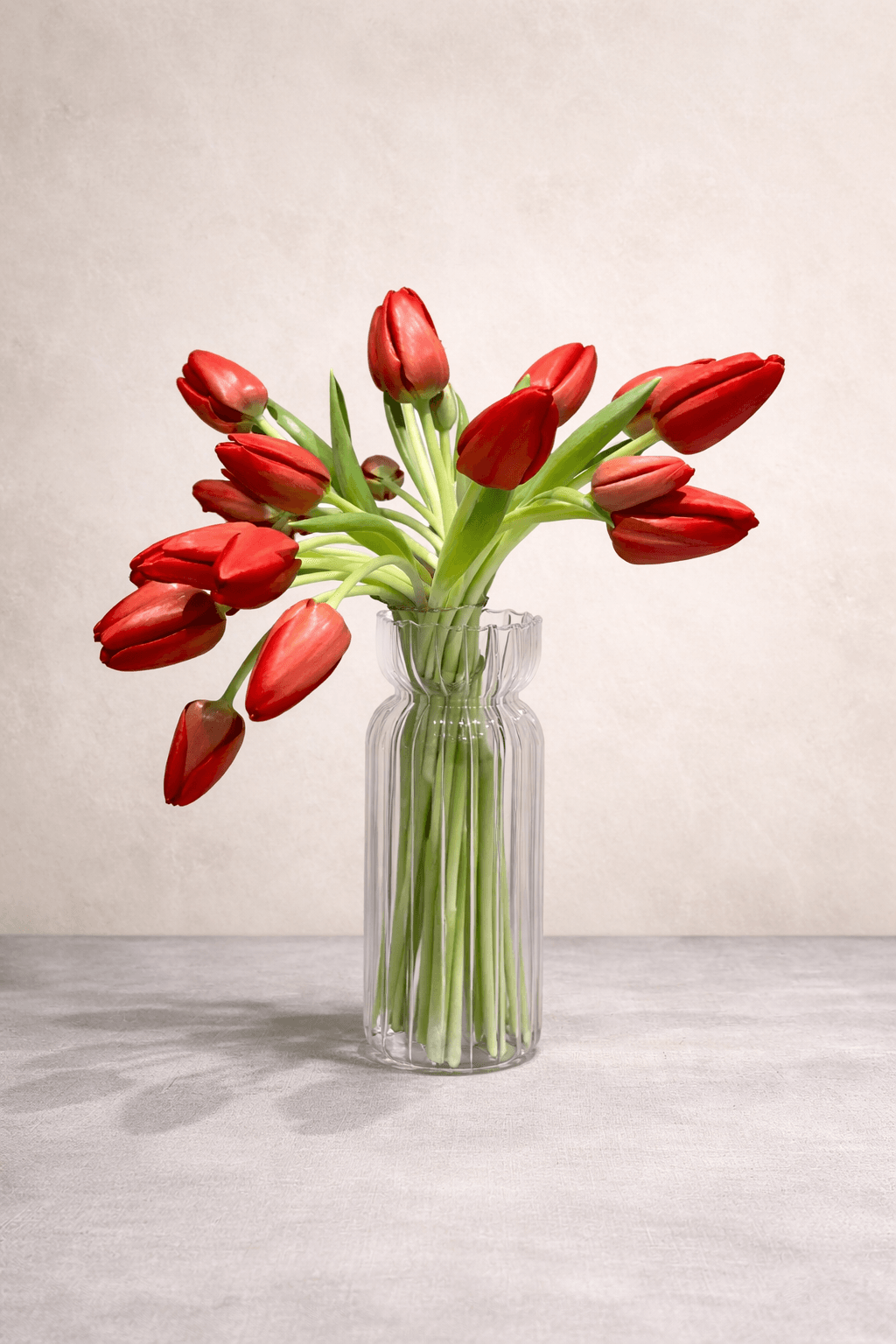 Twenty vibrant red tulips, elegantly arranged to make a bold and beautiful statement this Valentine’s Day.